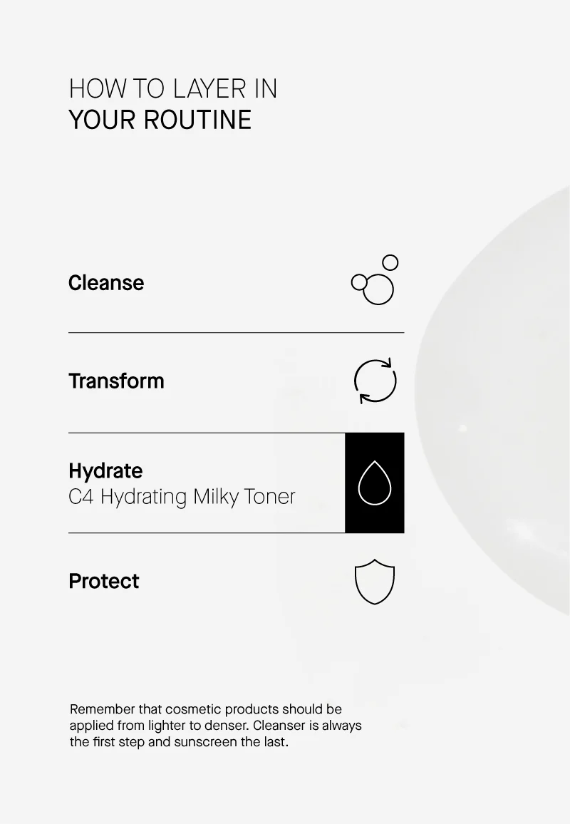 Tekstura e tij e lehtë përthithet shpejt, duke lënë një ndjesi të qëndrueshme hidratimi dhe rehatie gjatë gjithë ditës. Hidraton thellësisht, qetëson, riparon, ndriçon dhe forcon barrierën mbrojtëse – duke përgatitur lëkurën tuaj për hapin tjetër në rutinën tuaj. Ideale për lëkurë të dehidratuar, të ndjeshme ose me ndjesi të ngushtë.