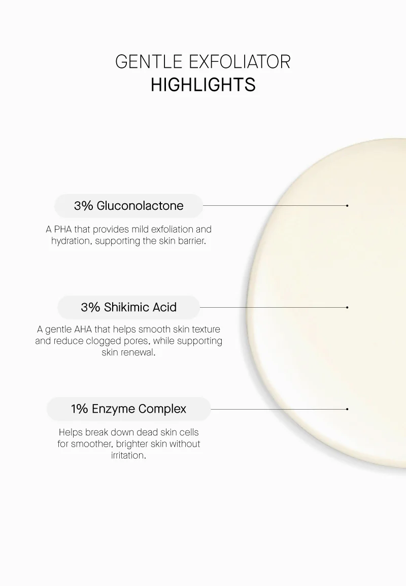 Formula e saj përmban 3% glukonolakton (PHA), i cili eksfolion butësisht ndërsa hidraton dhe forcon barrierën e lëkurës. Një acid shikimik 3%, një AHA e gjeneratës së ardhshme, përmirëson strukturën, zvogëlon njollat dhe ofron përfitime antioksiduese që ndihmojnë në parandalimin e plakjes së parakohshme dhe në barazimin e tonit të lëkurës. Duke kompletuar formulën, një kompleks enzimatik 1% vepron butësisht në lëkurë, duke ndihmuar në heqjen e qelizave të vdekura pa fërkim, duke respektuar ekuilibrin natyror të lëkurës.