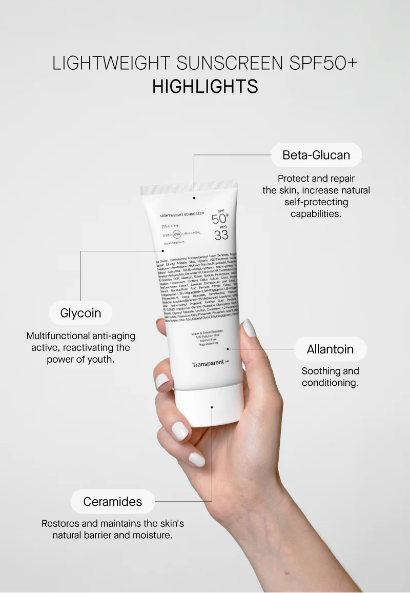 LIGHTWEIGHT SPF50+ përmirëson hidratimin dhe forcon barrierën e lëkurës falë Kompleksit të Ceramideve, Allantoinës dhe Beta-Glucan-it. Formula e tij përmban përbërës aktivë me veprim mbrojtës (Ciste’M dhe Ectoin), anti-rrudhë (Glikoin dhe BIO GF) dhe kundër njollave kafe (ADN Aura) që ndihmojnë në reduktimin e stresit qelizor që shkakton plakjen e parakohshme të lëkurës dhe e mban atë të mbrojtur nga rrezet UV, rrezatimi dhe ndotja e mjedisit.