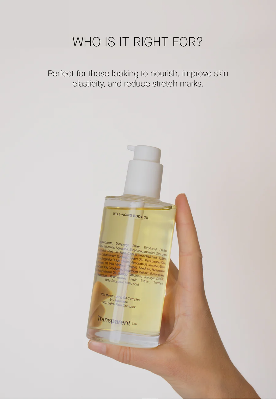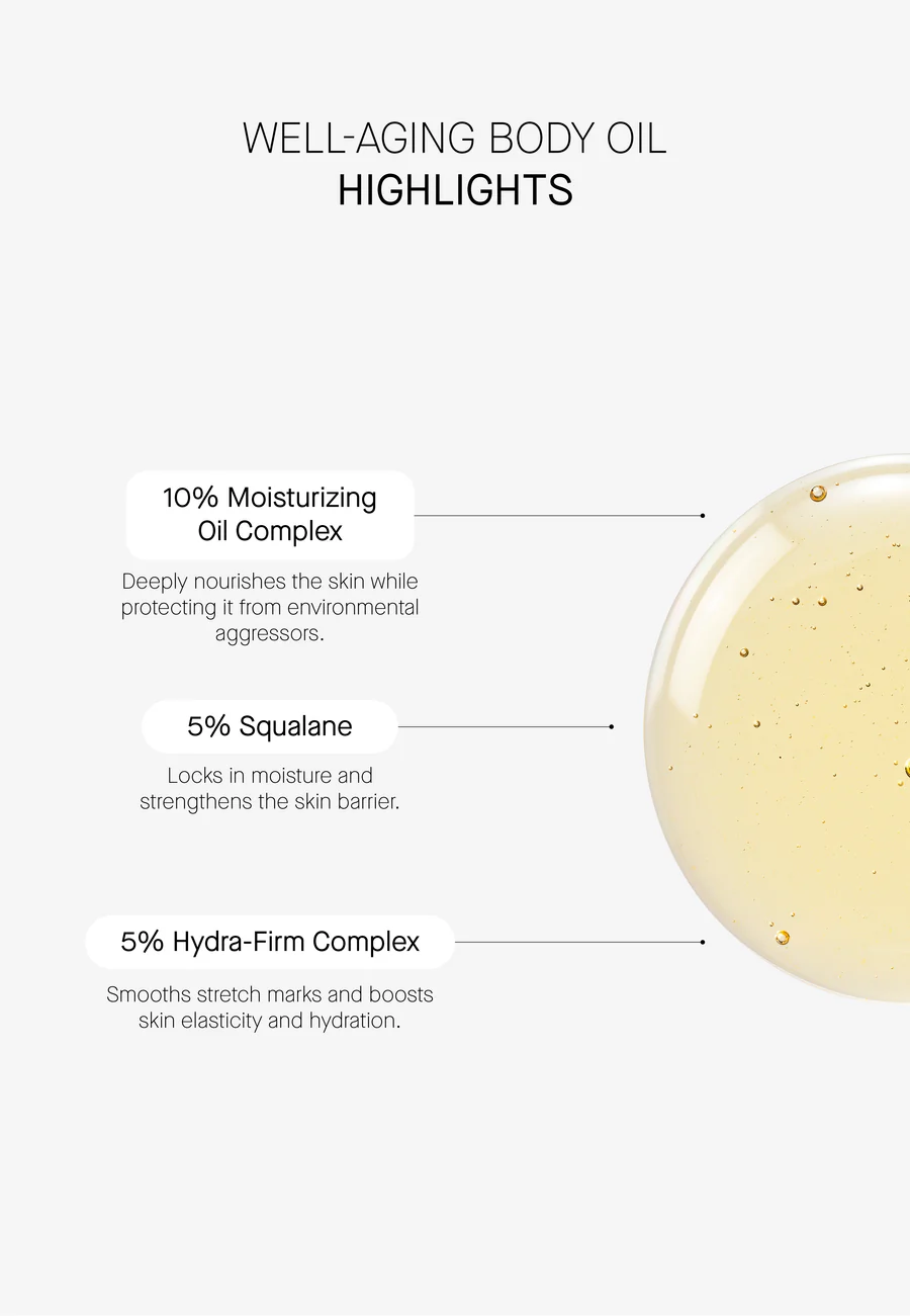 I formuluar me 5% Kompleks Hydra-Firm, ndihmon në zbutjen e pamjes së strijave dhe përmirëson dukshëm elasticitetin, duke e lënë lëkurën më të fortë dhe më elastike. Përmban një përzierje unike vajrash të pasur me antioksidantë dhe të mbushur me vitamina që mbrojnë lëkurën ndërsa ofrojnë ushqim intensiv. Së fundmi, skualani vepron si një zbutës, duke ofruar hidratim afatgjatë.
