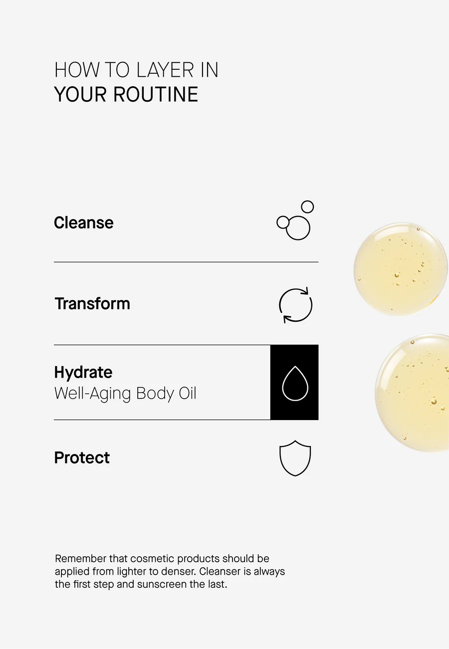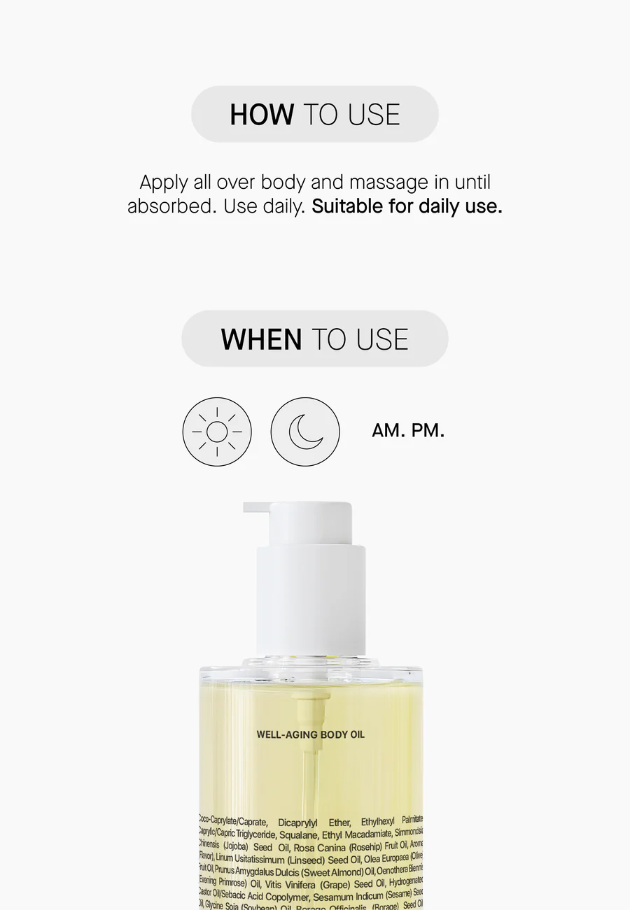 Ideal për qafën, dekoltenë dhe trupin, ky vaj i lehtë e lë lëkurën të shkëlqyeshme, të ushqyer dhe të lëmuar si mëndafsh, pa mbetje yndyrore.